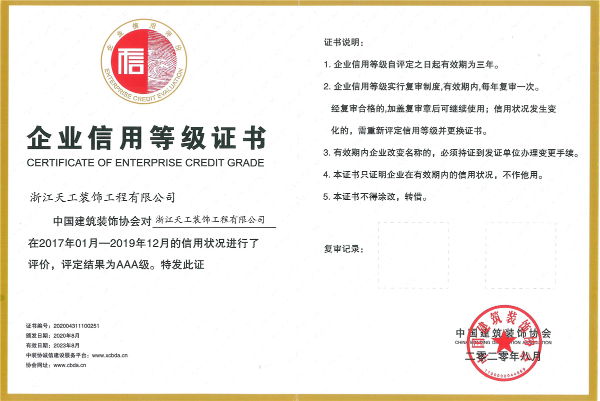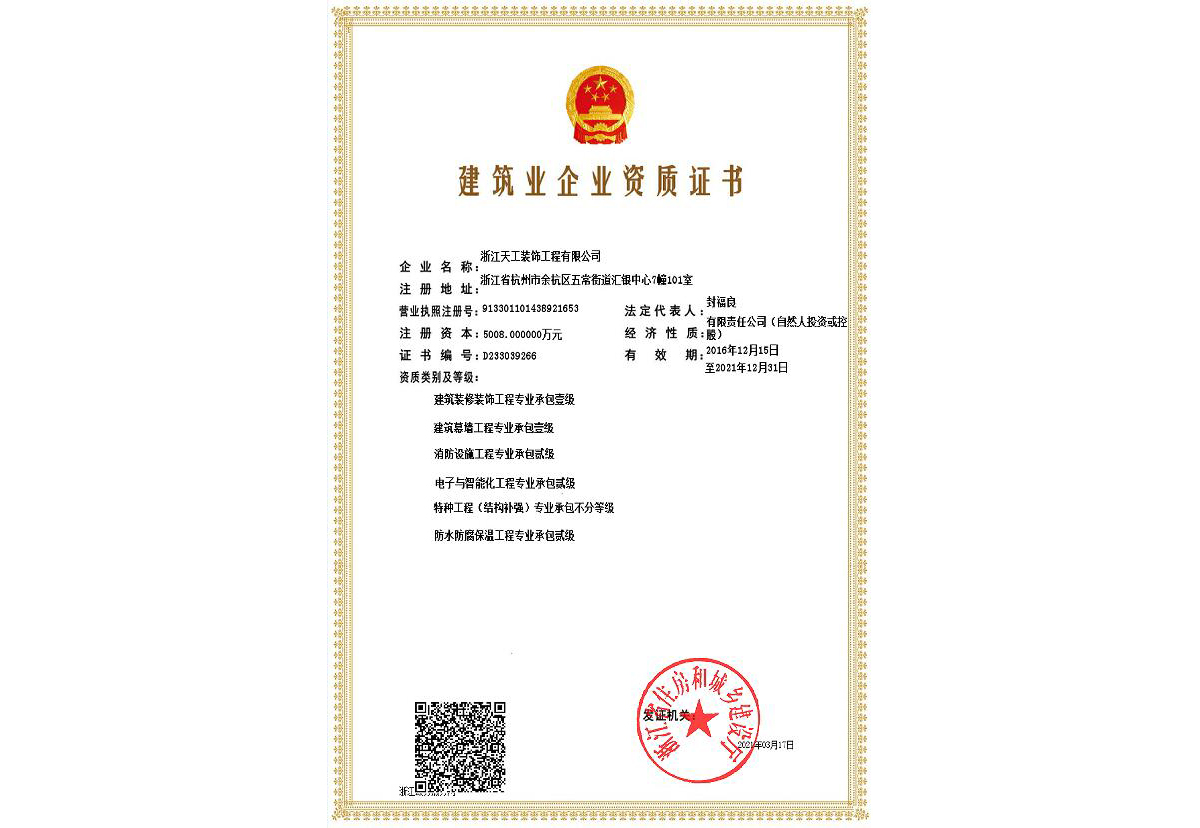 浙江天工裝飾工程有限公司成立于1994年,是一家專注于建筑行業近三十年,余杭區內規模最大、最專業的現代化專業承包企業,連續十二年榮獲“余杭區建筑業十強企業”稱號。公司現任余杭區建筑裝飾行業協會會長單位、杭州市建筑裝飾行業協會副會長單位、浙江省建筑裝飾行業協會副會長單位、中國建筑裝飾協會理事單位。公司具備建筑裝修裝飾工程專業承包壹級、建筑幕墻工程專業承包壹級、建筑裝飾工程設計專項甲級、建筑幕墻工程設計專項甲級、展覽陳列工程設計施工一體化貳級、電子與智能化工程專業承包貳級、消防設施工程專業承包貳級、防水防腐保溫工程專業承包貳級,集建筑工程施工總承包、建筑機電安裝、城市及道路照明、鋼結構、結構補強、安防施工等多項資質。主要從事大型公共建筑、星級酒店的室內精裝修、建筑幕墻及建筑智能化工程的設計與施工。 天工裝飾始終把建筑裝飾當作一項 “美的事業”,在施工中嚴把質量關,不斷規范和提升工程技術標準。近年來,公司承建的浙商開元名都國際酒店I標段裝飾工程、杭州藝尚雷迪森廣場酒店裝修工程、余杭區時代廣場5號樓(市民之家)室內裝飾工程、永安之星室內裝飾工程、青山湖科技城創業廣場裝修工程、杭州未來科技城醫院室內裝飾工程、杭州師范大學附屬實驗學校裝修工程、杭州老板電器股份有限公司辦公樓裝飾工程、深川控股集團綜合樓幕墻工程、浙江省科技信息研究院幕墻工程、北航杭州創新研究院(余杭)內裝及智能化提升改造項目(研究生院)工程、臨平新城人才服務中心設計釆購施工(EPC)工程總承包項目、浙江大學先進電氣裝備創新中心室內外裝飾及改造項目設計采購施工(EPC)工程總承包項目等,先后獲得“中國建筑工程裝飾獎”、“全國建筑裝飾科技創新獎”、浙江省建設工程“錢江杯”優質工程獎、杭州市建設工程“西湖杯”優質工程獎、嘉興市建設工程“南湖杯”優質工程獎、“浙江省優秀建筑裝飾工程獎”、“浙江省優質安裝質量獎”等榮譽。 天工裝飾恪守“誠實守信、文明經營”,近年來公司得到了客戶的信賴也獲得了業界的好評,先后被評為“國家級守合同重信用單位”、“全國建筑裝飾行業AAA級信用企業”、“全國百家科技創新型企業”、“浙江省AAA級守合同重信用單位”、“人民銀行信用等級AAA級企業”、“浙江省信用管理示范企業”、“浙江省誠信企業”、“浙江省建筑裝飾行業強優企業”、“杭州市建筑業優秀企業”、“余杭區建筑業十強企業”、 “余杭區人民政府質量獎”等榮譽。